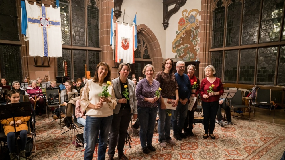 Im Anschluss ging es in Kleingruppen weiter, in denen mit den Dozenten weitere Musikstücke verschiedener Stile erarbeitet wurden. Am Nachmittag wurden die Stücke im Plenum noch einmal wiederholt und verfeinert, bevor es nach einer Kuchen-Pause in den Rathausfestsaal ging, wo die Teilnehmerinnen und Teilnehmer angeleitet von den Dozenten ihre Plätze einnahmen und vor Publikum das an diesem Tag erarbeitete Repertoire vortrugen.