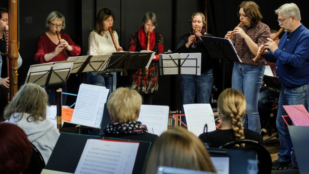 Zunächst aber stellten sich die Dozentinnen und der Dozent mit einem kleinen Konzert vor. Miriam Grapp, Leiterin des Blockflötenorchesters „Pian‘ e forte Kaiserslautern“, unterstützte die Blockflötenlehrkräfte der Musikschule (Monika Anstett, Esther Klein, Barbara Neumeier-Zonker, Ingrid Paul, Bernhard Stilz und Elisabeth Weyers) als Gastdozentin und übernahm die Leitung des großen Blockflötenorchesters.